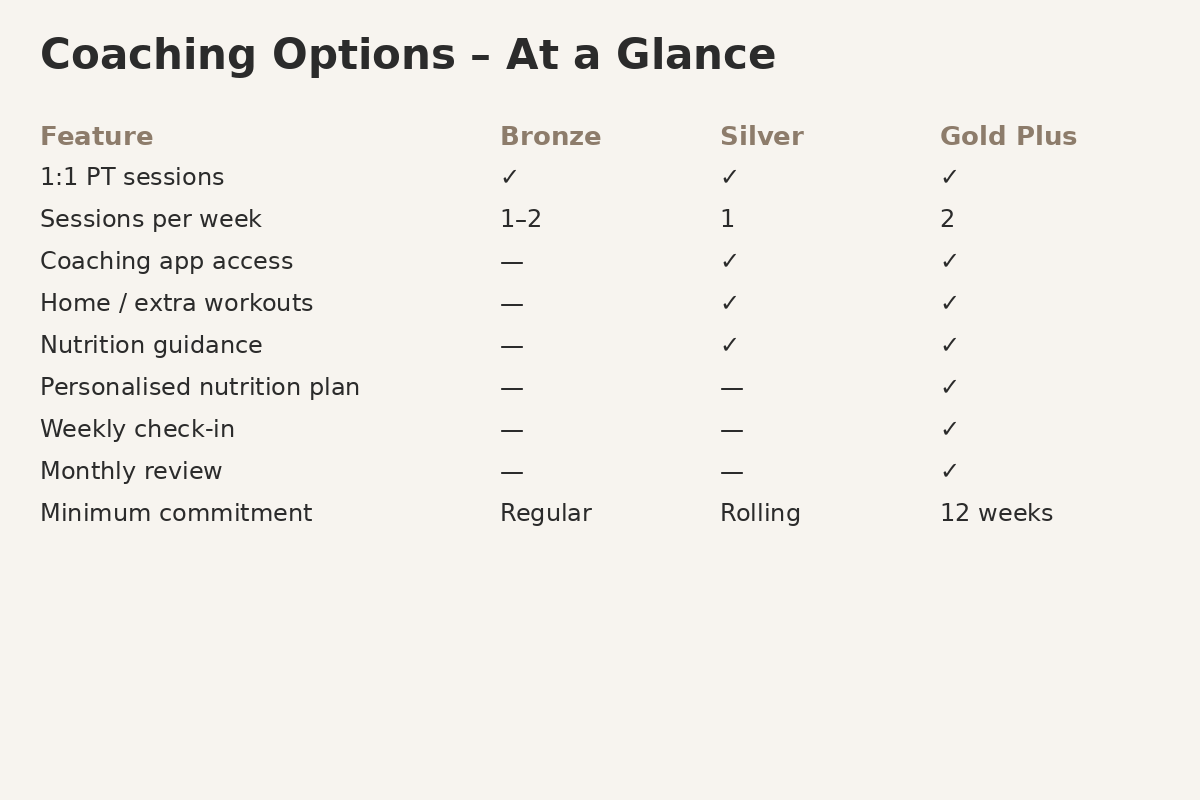 Gold Plus Coaching is a minimum 12 week commitment. This allows enough time to build consistency, make progress and get the most from the coaching process. We will review at the end of the 12 weeks to discuss whether to continue, step down to silver or take a break.